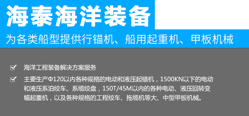 江蘇海泰海洋裝備有限公司位于素稱(chēng)“銀杏之鄉(xiāng)”的泰興市,2018年投資建設(shè),至今已經(jīng)成為產(chǎn)品研發(fā)、生產(chǎn)制造,調(diào)試服務(wù)為一體的設(shè)備配套企業(yè)。公司從事海洋裝備(設(shè)備)及配件的制造、設(shè)計(jì)、安裝,維修;船用錨機(jī)、絞車(chē)、起重機(jī)、舾裝件、電氣設(shè)備、環(huán)保設(shè)備設(shè)計(jì)、制造。公司成立以來(lái),就與中國(guó)船舶工業(yè)集團(tuán)公司第701所、702所、704所、708所、上海船舶研究設(shè)計(jì)院等多家船舶科研院所建立了技術(shù)合作關(guān)系,產(chǎn)品應(yīng)用于......